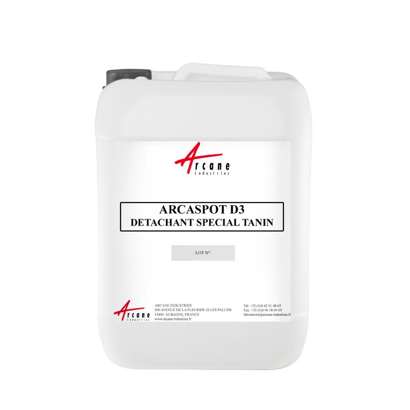 ARCASPOT D3 est un détachant textile spécifique pour les taches de tanins. Sa solution acide, concentrée en agents mouillants, solubilisants et détergents, permet de traiter efficacement les taches de soda, jus de fruits, fruits rouges, vin, café, thé, herbes et pigments, notamment sur textiles colorés sensibles aux agents de blanchiment. Il s’utilise en traitement localisé avant lavage, en blanchisseries, pressings, hôtellerie et laveries professionnelles.